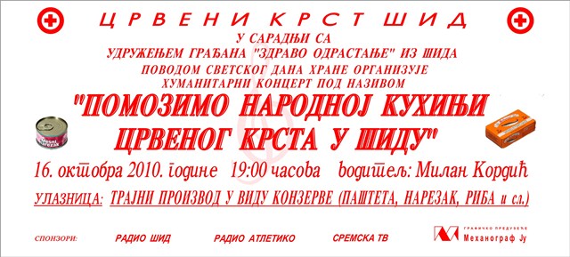 Povodom Svetskog dana hrane 16. oktobra organizacija Crvenog krsta Šid u saradnji sa udruženjem građana “Zdravo odrastanje“ organizuje humanitarni koncert pod nazivom “Pomozimo Narodnoj kuhinji Crvenog krsta u Šidu“ Koncert će se održati u subotu 16. oktobra u sportskoj hali u Šidu sa početkom u 19 časova. Na koncertu učestvuju finalisti manifestacije “Pesmom protiv pušenja,droge,side i alkohola“ kao i brojni gosti.